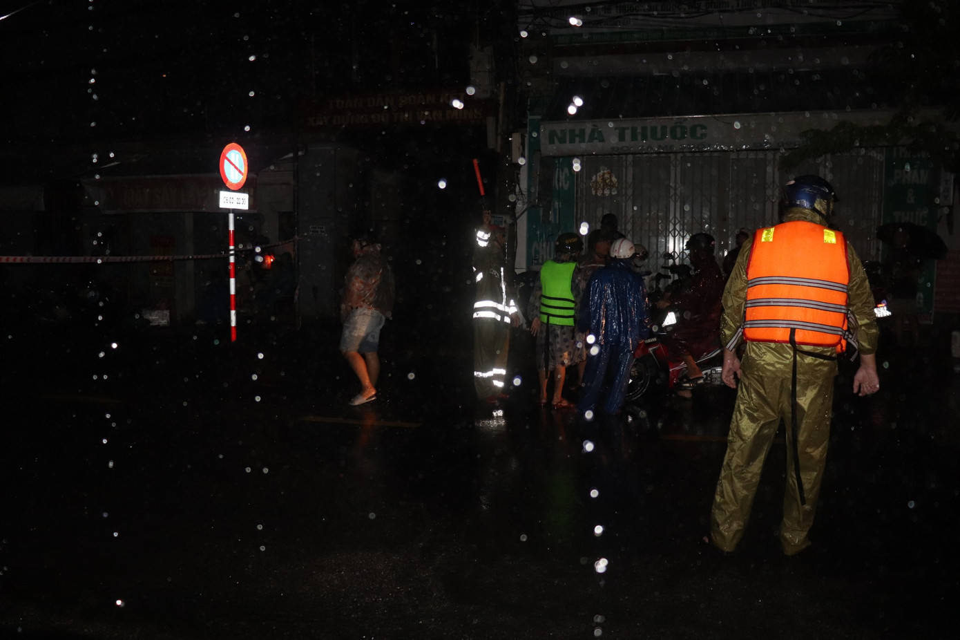 | Trời khuya, đường phố vắng người nhưng các lực lượng vẫn đứng canh để đảm bảo an toàn trên tuyến đường đã bị nước ngập. |