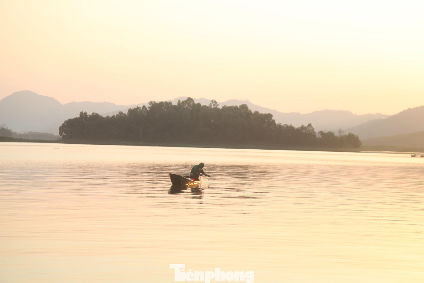 Trời se lạnh, mặt hồ phẳng lặng, ngư dân đưa thuyền ra giữa lòng hồ Cấm Sơn để săn cá