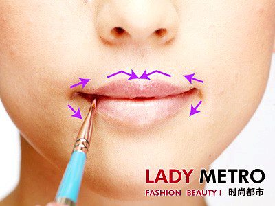 Dùng bút tô môi, tô từ hai khóe môi đến trung tâm( theo hình mũi tên trong hình vẽ). Chú ý viền môi không tô quá phạm vi của môi.