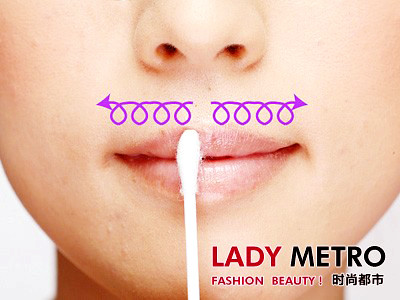 Sau khi bóc giấy bóng mỏng ra, dùng tăm bông xoa nhẹ trên môi theo chiều mũi tên như trên hình vẽ. Lớp tế bào chết sẽ dễ dàng bị đánh bật do quá trình dùng giấy bóng kính làm đẹp.