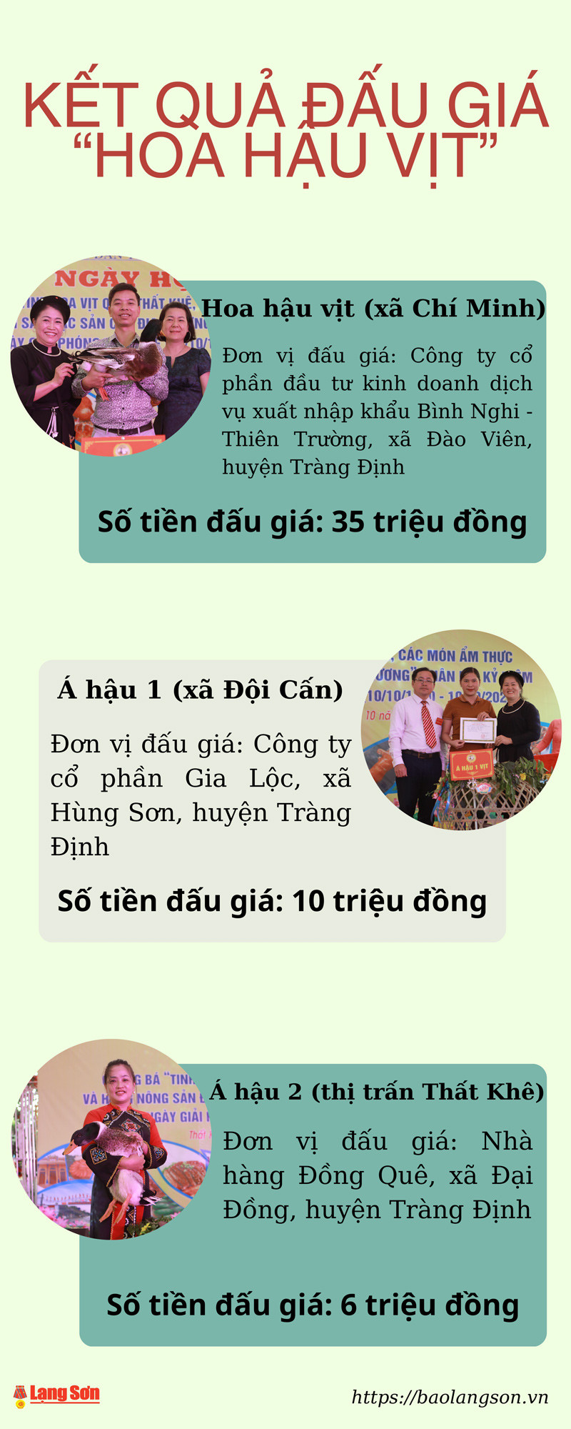 Trước đó, trong khuôn khổ các hoạt động chào mừng kỷ niệm 73 năm ngày giải phóng Thất Khê, UBND huyện và thị trấn Thất Khê đã tổ chức cuộc thi “Hoa hậu vịt” lần thứ nhất năm 2023 với sự tham gia của 21 xã, thị trấn trên địa bàn huyện. Kết quả, Ban Tổ chức trao giải cho đơn vị có vịt dự thi đẹp nhất. Cụ thể: “Hoa hậu vịt” thuộc về xã Chí Minh; Á hậu 1 thuộc về xã Đội Cấn; Á hậu 2 thuộc về thị trấn Thất Khê. Thông qua cuộc thi góp phần bảo tồn, phát triển giống vịt có chất lượng cao, quảng bá, giới thiệu, duy trì về thương hiệu “Vịt đầu xanh”, tôn vinh người chăn nuôi vịt trên địa bàn huyện Tràng Định; thu hút sự quan tâm của các doanh nghiệp, người chăn nuôi, qua đó thúc đẩy sự phát triển chuỗi sản xuất tiêu thụ các sản phẩm thịt vịt (vịt quay Tràng Định), nâng cao giá trị sản phẩm.