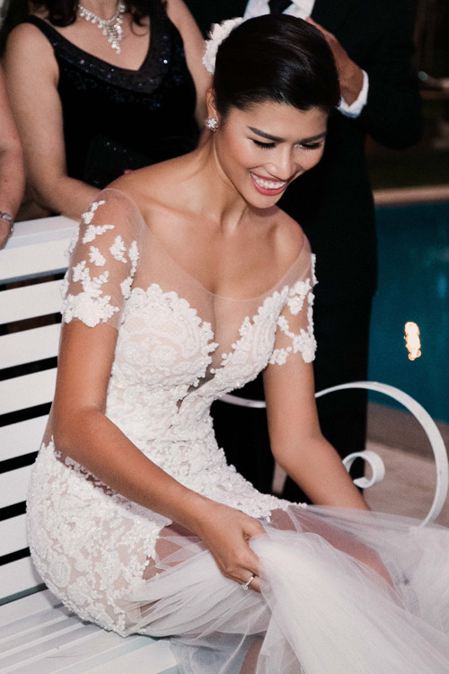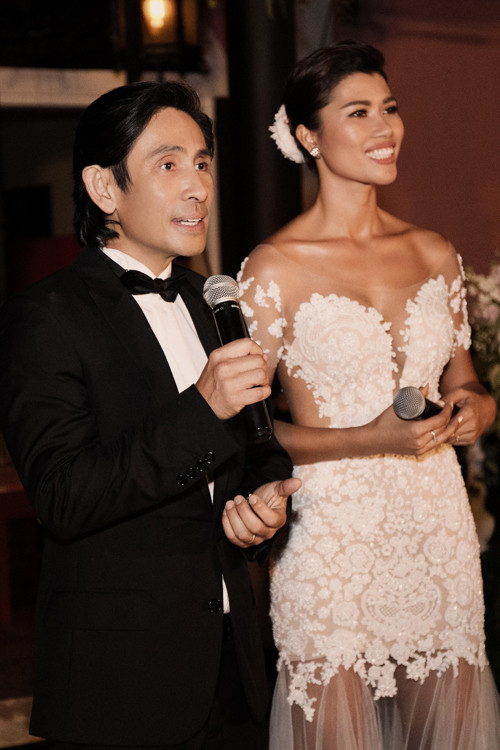 Buổi tiệc đứng theo phong cách phương Tây diễn ra bên hồ bơi khuôn viên nhà. Trang Lạ diện váy của nhà thiết kế Trương Thanh Hải, rạng rỡ hạnh phúc bên ông xã trong bộ vest Dior.