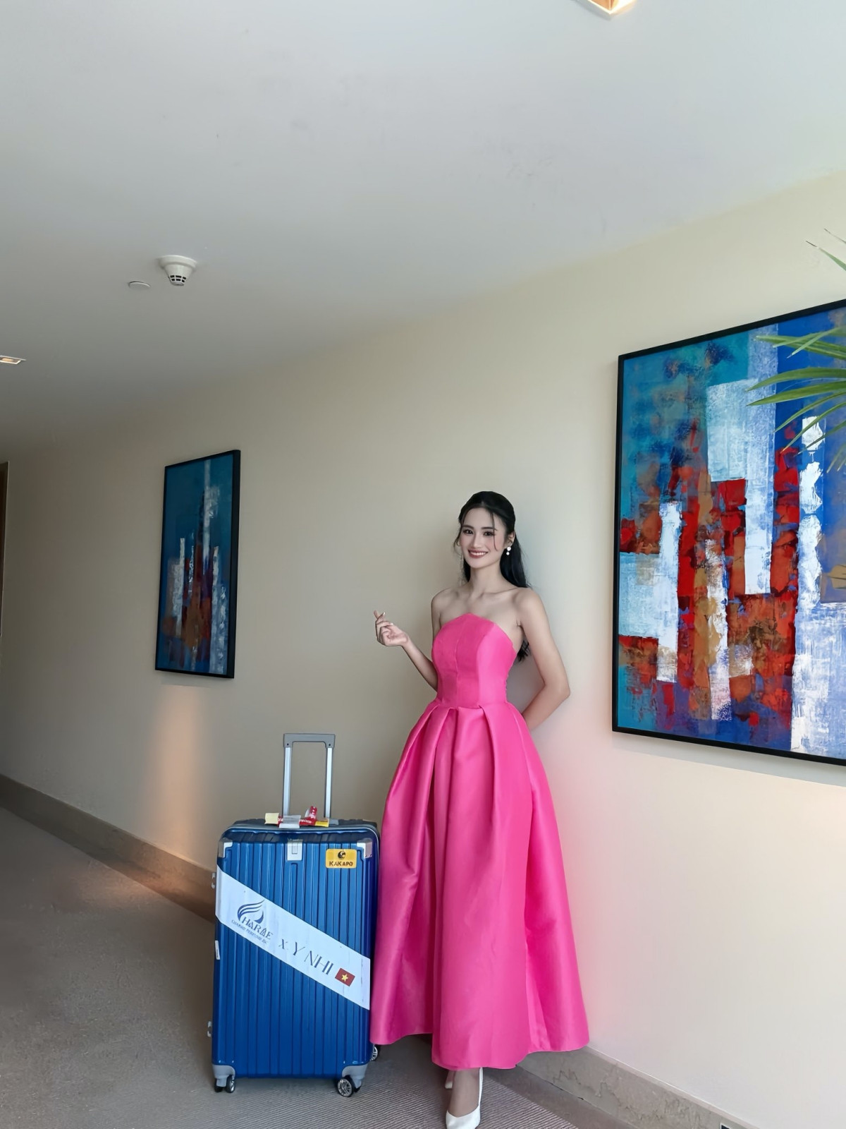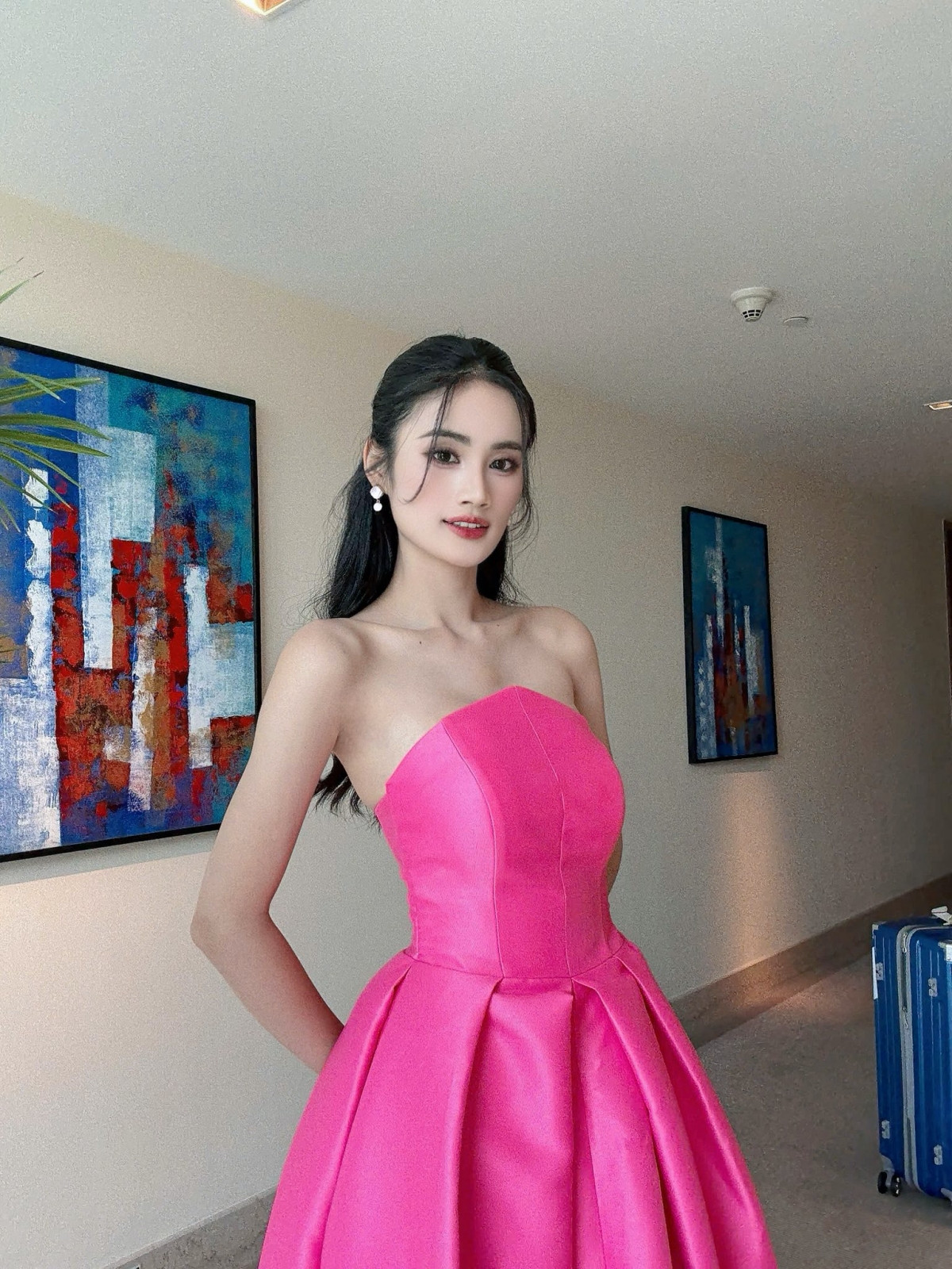 Hoa hậu Ý Nhi xuất hiện rạng rỡ trong ngày đầu nhập cuộc, cô diện thiết kế cổ điển với tông màu hồng nổi bật, dáng cúp ngực. Trang phục giúp Ý Nhi nhận phản hồi tích cực từ khán giả.