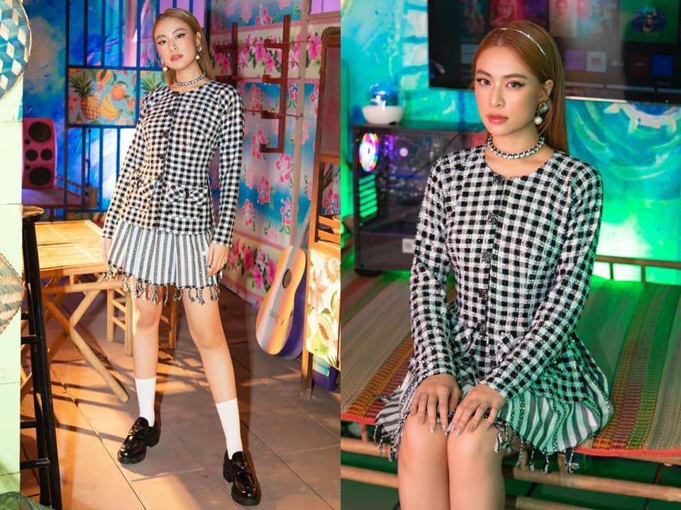 Lấy cảm hứng từ trang phục áo bà ba và chiếc khăn rằn đặc trưng của người dân miền Tây, stylist Hoàng Ku sử dụng vải dệt khăn rằn để may thành chiếc áo bà ba cách tân, phối cùng chân xếp li, vòng chocker, giày đế bệt và đính kết hạt Swarovski lên toàn bộ trang phục để tạo nên một tổng thể vô cùng hiện đại. Điểm đặc biệt là đôi khuyên tai được tái chế từ những nắp chai phế thải, kết hợp với ngọc trai và đá, làm hoàn toàn thủ công.