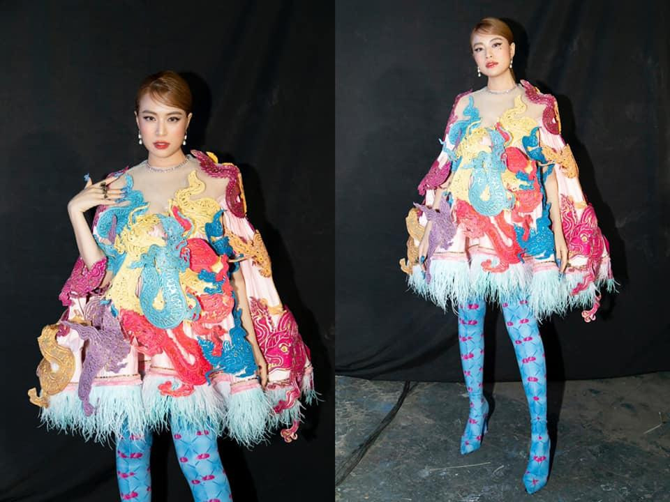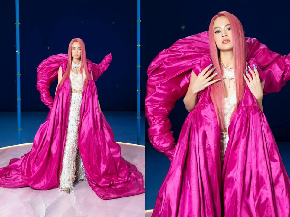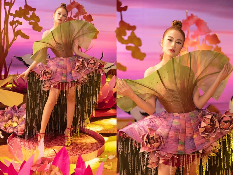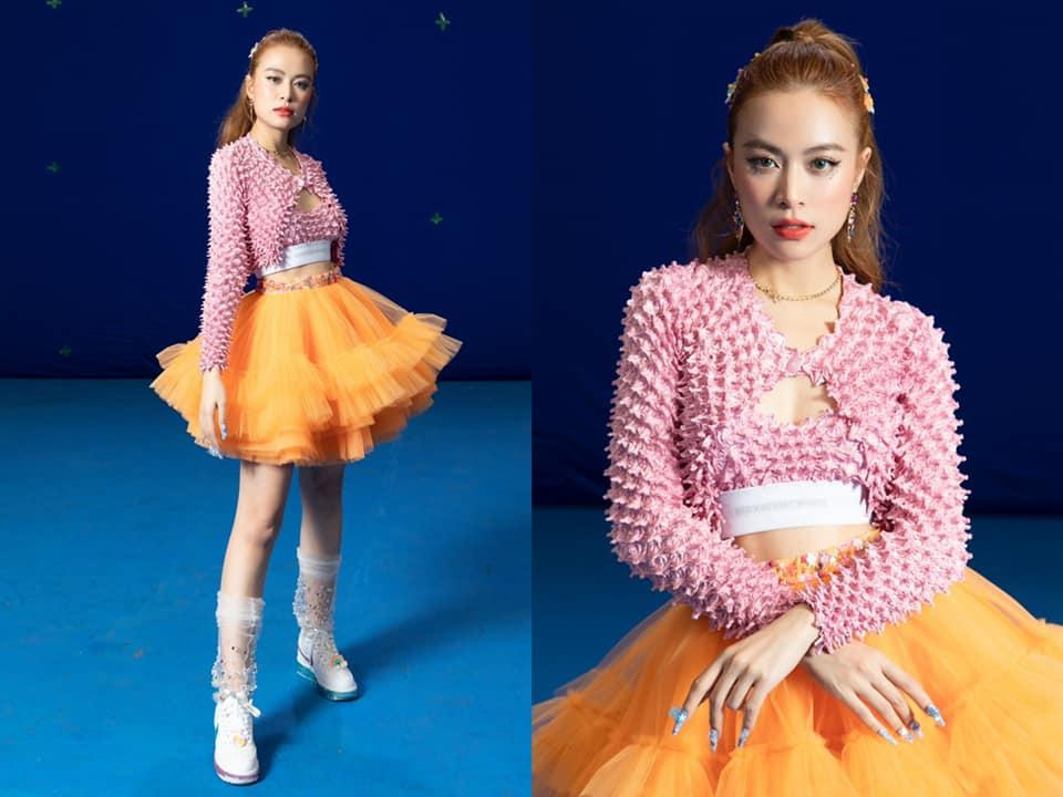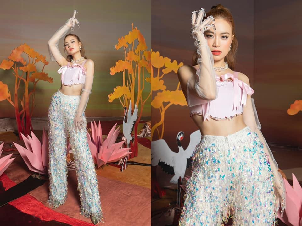 Để thể hiện hình tượng nàng tiên cá, Hoàng Ku quyết định làm mới bằng một bộ jumpsuit thời thượng. Chiếc quần được đính nhiều tầng ren và các hạt nhựa tua rua 7 màu có tác dụng bắt sáng tốt. Phần áo khoác vây cá hồng được làm nên từ vải tái chế, đính ngọc trai và đá trong suốt cầu kỳ tạo nên hình tượng người cá kiêu sa và quyền lực.