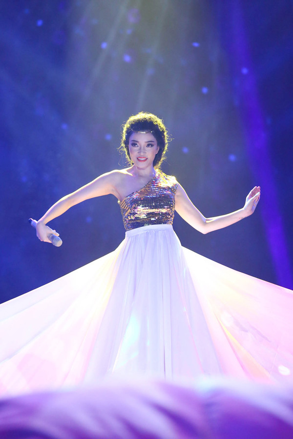 Chọn ca khúc Chuông gió- ‘hit’ khó của Nữ hoàng nhạc Dance Thu Minh, Phạm Thu Hà xuất hiện lộng lẫy với chiếc váy lụa dài rộng che phủ cả sân khấu với sự hỗ trợ của các vũ công.