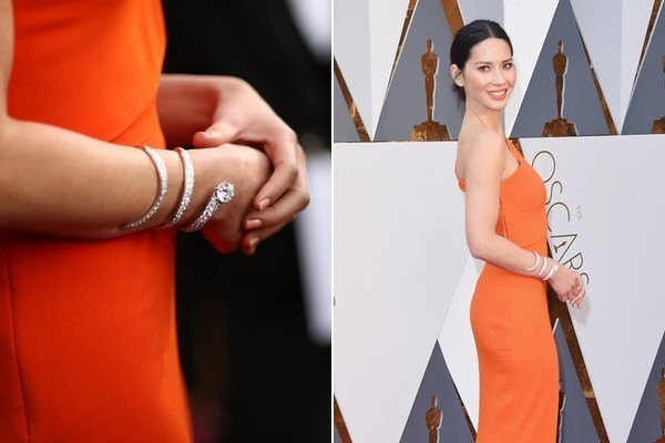 Olivia Munn ghi điểm với cách phối phụ kiện tối giản nhưng sang trọng. Theo Popsugar, chiếc vòng tay hình rắn được chế tác rất kỳ công (tốn 120 giờ đồng hồ) và có giá 1 triệu USD.