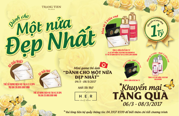 “Dành Cho Một Nửa Đẹp Nhất”. Cuộc thi được tổ chức trên Fanpage chính thức với mục đích lưu giữ những bức ảnh ấn tượng đáng nhớ tại Tràng Tiền Plaza. Theo đó, khách hàng sẽ được nhiếp ảnh gia của Tràng Tiền chụp hình trực tiếp, sau đó ban tổ chức sẽ up những bức hình lên fanpage sự kiện: “Dành cho nửa đẹp nhất” và người tham gia sẽ tìm ra bức hình đẹp nhất của mình kèm theo đó là thực hiện các thao tác sau: like, share fanpage, comment thông tin cá nhân kèm theo lời bình.