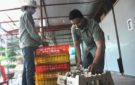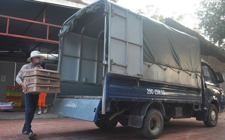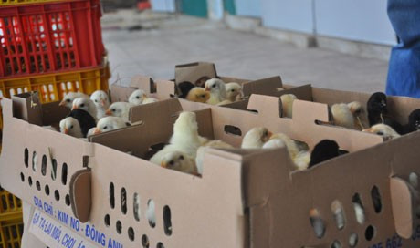Gà được bỏ vào khay hộp trước khi chuyển lên xe xuất bán đi các tỉnh.