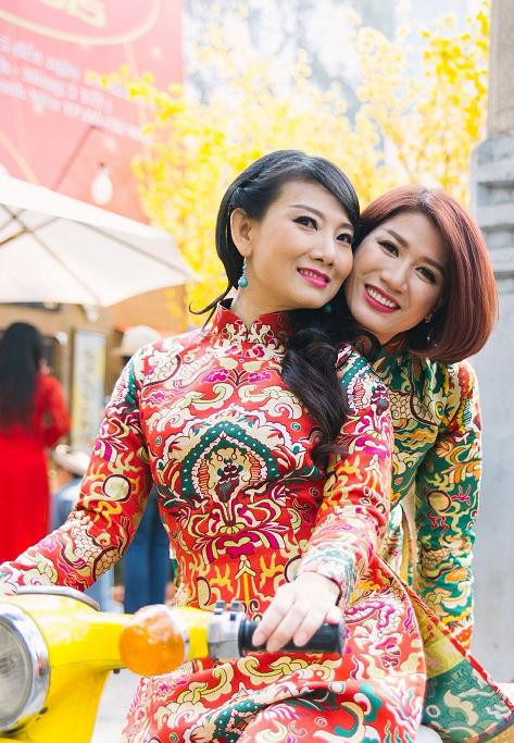 Hai người hóa thành những phụ nữ Sài Gòn xưa trên chiếc xe máy cổ.