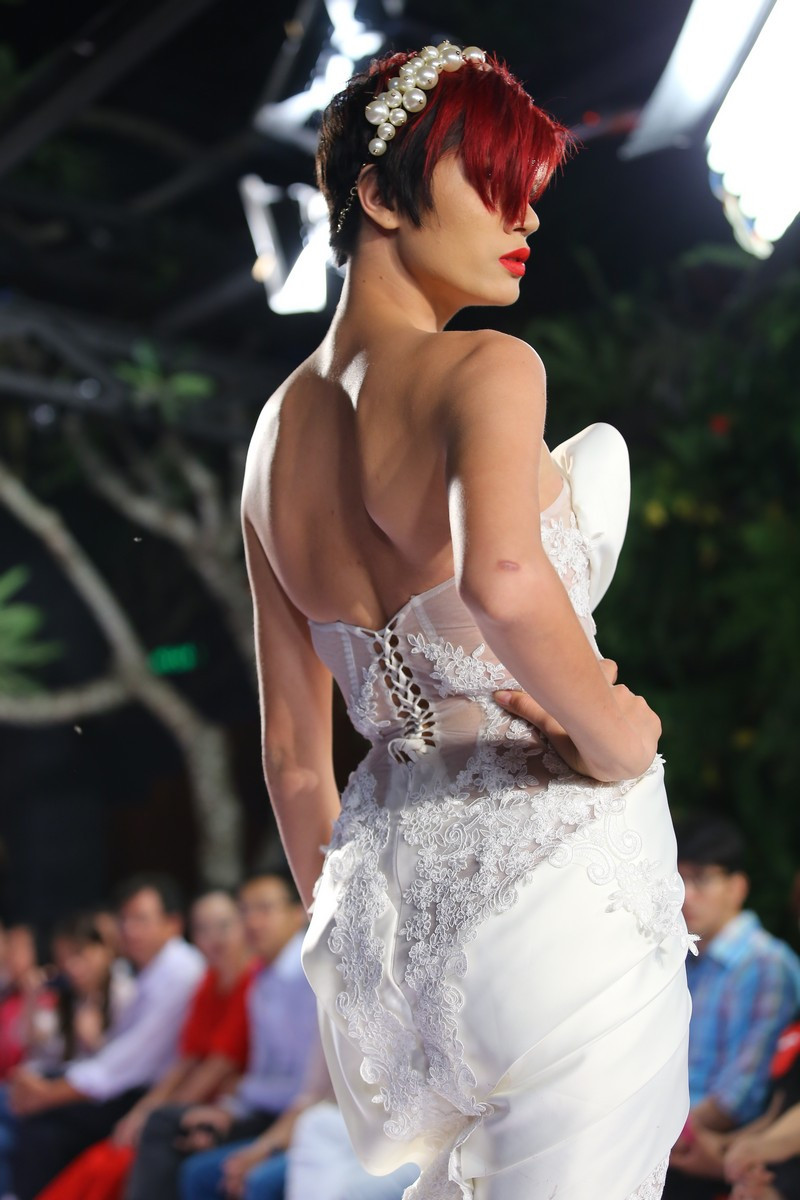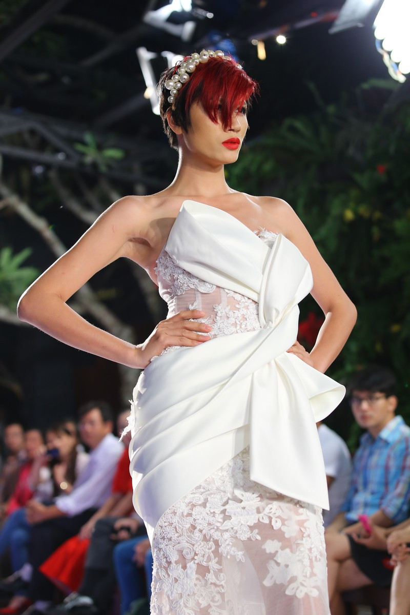Tuy trình diễn cùng dàn người mẫu đình đám nhưng Trang Trần vẫn nổi bật nhất trên sàn catwalk bởi mái tóc tém đỏ rực vô cùng cá tính. Nữ người mẫu diện váy cưới cầu kỳ khoe vẻ kiêu sa và gợi cảm.