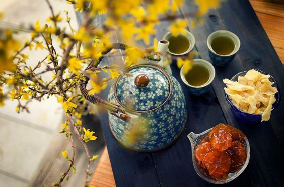 Bàn nước trang trí với mai vàng và bộ ấm chén hơi hướm cổ điển sẽ rất phù hợp với những gia đình ưa thích phong cách Tết cổ truyền.