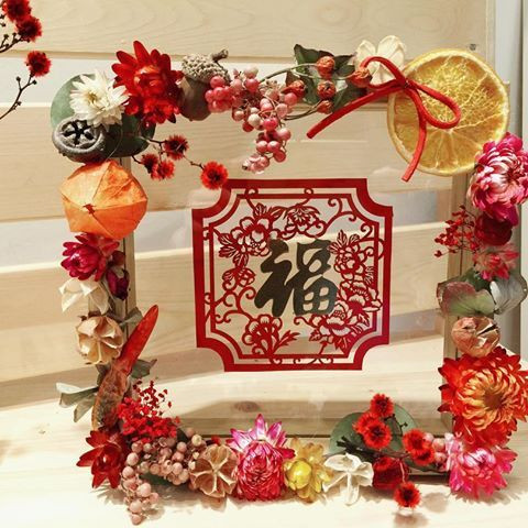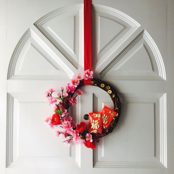Vòng treo cửa cũng có nhiều cách trang trí khác nhau, vòng tròn tượng trưng cho sự đủ đầy và hình vuông cho một năm mới sung túc.