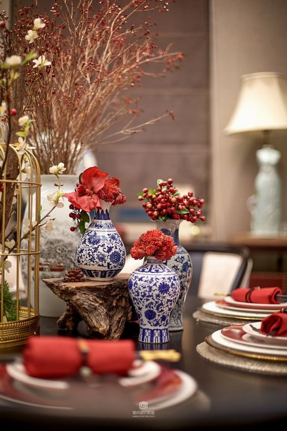 Gian phòng khách sẽ trở nên ấm cúng và sang trọng hơn khi khăn trải bàn, gối ôm, dây treo đều đồng loạt thay sắc đỏ đón xuân.