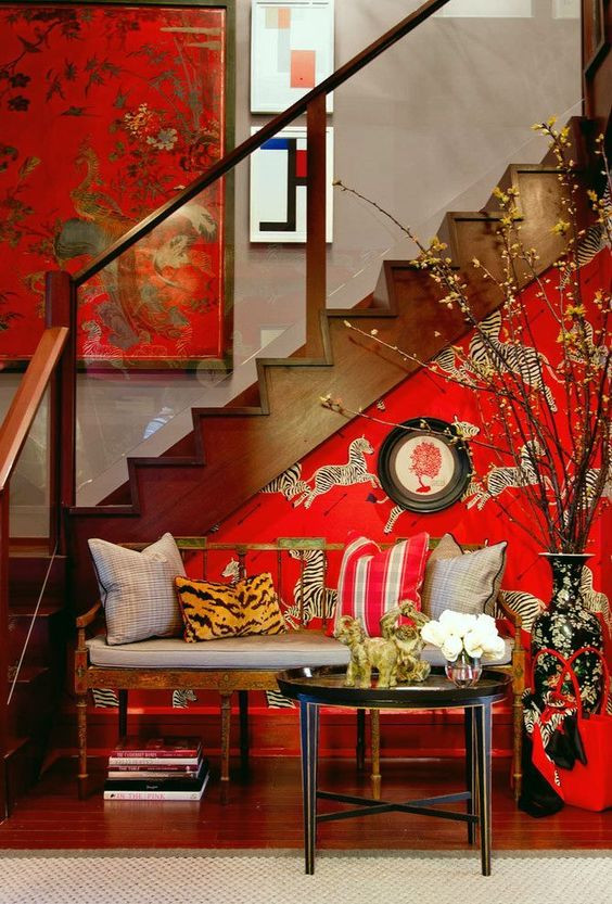 Một góc nhà đón Tết với các mẫu tranh và giấy dán tường màu đỏ điểm vàng.