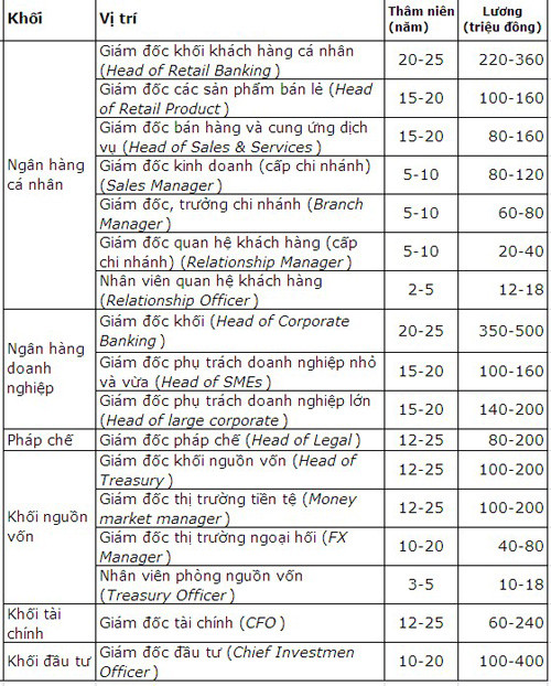 Trong nhóm ngành tài chính - ngân hàng, thống kê của Adecco cho thấy, lương của lãnh đạo nắm các chức cấp cao như Giám đốc khối trung bình từ 220 đến 500 triệu đồng, tùy từng vị trí khối cũng như thâm niên công tác. Ví dụ, chức danh giám đốc khối khách hàng cá nhân lương khoảng 220-360 triệu đồng; giám đốc khối khách hàng doanh nghiệp lương 350-500 triệu đồng; giám đốc khối nguồn vốn cao nhất khoảng 200 triệu đồng.
