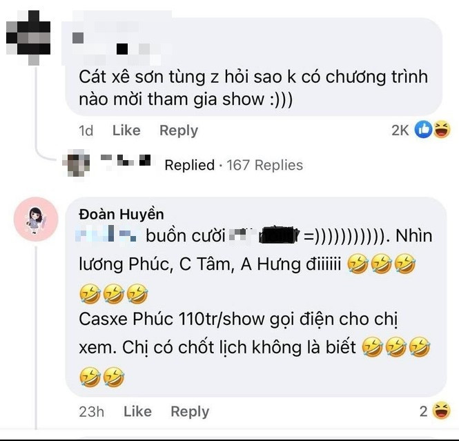 Ngay lập tức, quản lý của nam ca sĩ đã lên tiếng đáp trả dưới phần bình luận bài viết. Cô cho biết với cát-xê như này không thể nhận lịch diễn cho ca sĩ, thậm chí mức thu nhập của hai nghệ sĩ Đàm Vĩnh Hưng và Mỹ Tâm lớn hơn nhiều so với con số 120 triệu đồng/ show và 150 triệu đồng/ show.