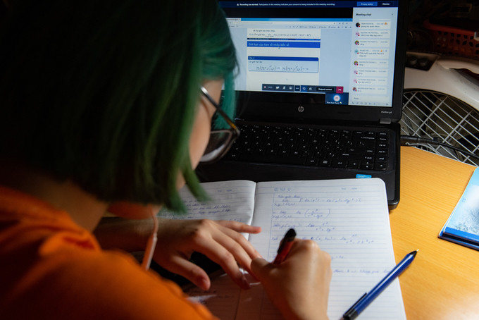 Trong tiết học online qua ứng dụng Microsoft teams trên máy tính, Thảo chăm chú viết bài và lắng nghe thầy giảng qua tai nghe. “Trước đây em phải dậy từ 6h để sửa soạn áo quần rồi đi học, nhưng giờ thì 6h45 em dậy mở máy tính hoặc điện thoại lên cũng kịp vào lớp đúng giờ. Chỉ khi điểm danh và phát biểu trên lớp em mới bật micro nên việc học khá thoải mái và dễ tập trung hơn trước”, Thảo cho biết.