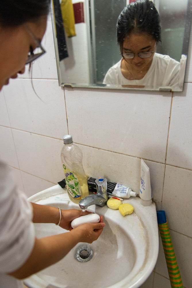 Cùng phòng với Thảo, Lê Thu Hiền, quê Thái Bình, rửa tay sạch sẽ bằng xà phòng trong lúc đợi đồ ăn mang lên. Từ khi Covid-19 bùng phát, Hiền chú ý việc vệ sinh trước khi ăn uống và sau khi vào phòng hơn trước.