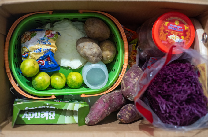 Đồ ăn sẵn trong phòng trước đây của Thảo chỉ có thùng mì tôm thì hiện giờ có thêm các món đồ khô, rau, củ, quả đủ để ăn trong một tuần. Thảo kể, bình thường em sẽ đi ăn ngoài, gọi đồ về ăn hoặc úp bát mì cho nhanh chứ không nấu nướng tại phòng. Từ khi có dịch, gia đình gọi điện nhắc mua đồ sẵn để hạn chế ra ngoài nên mới có thùng đồ này.