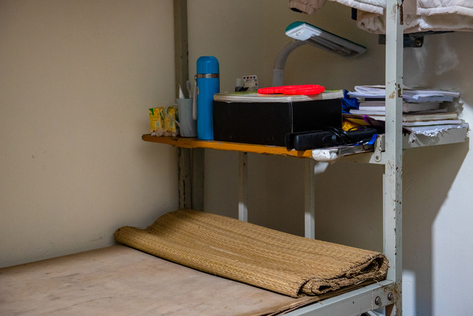 Phòng ký túc xá có 8 sinh viên, hiện 4 người đã về quê tránh dịch, đồ đạc, chiếu được xếp gọn.