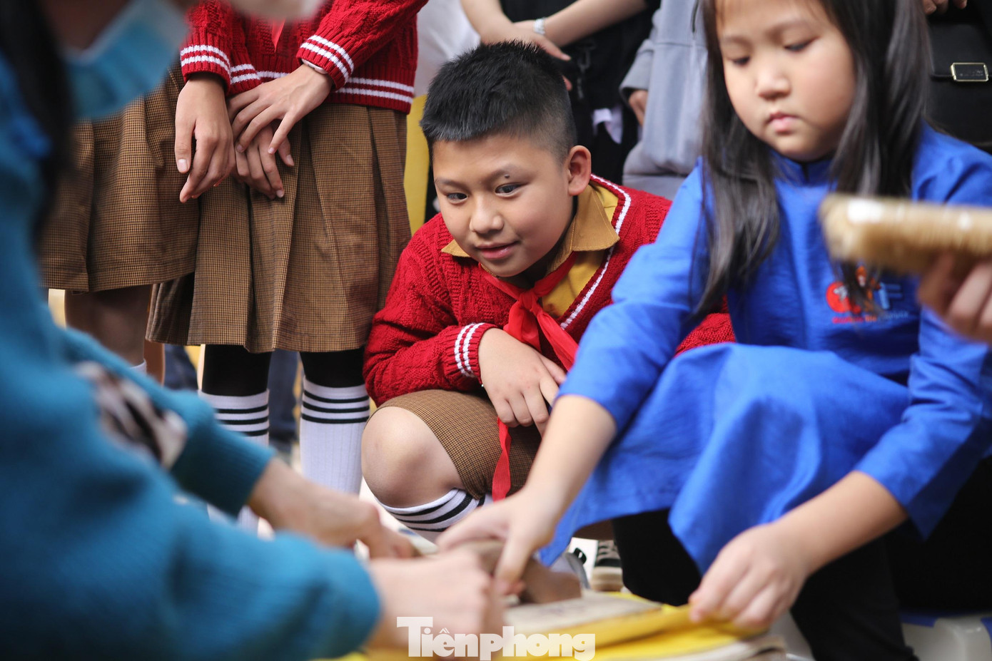 | Các em học sinh rất hứng thú với việc làm tranh Đông Hồ |
