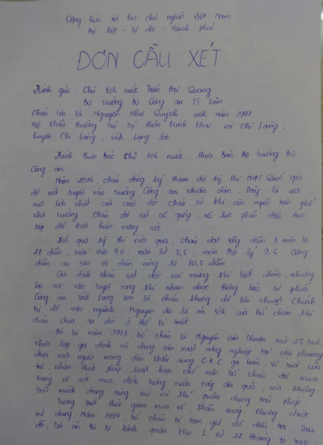 “Thôi các em ơi, các năm trước là xét lý lịch sau khi biết kết quả đậu. Vì vậy, Bộ công an mới chiếu cố. Nhưng năm nay lí lịch đã được xét trước và các em cũng đã biết có đủ điều kiện rồi. Vì sao các em vẫn cố quá vậy. Quy định tuyển sinh của Bộ đặt ra như vậy là đều có nguyên do. Bởi ngành công an là ngành liên quan trực tiếp đến an ninh, giữ gìn trật tự xã hội và là ngành thực thi pháp luật. Như vậy việc xét lý lịch như vậy là đúng. Con người đó phải có nhân thân tốt, lý lịch trong sạch. Lỡ may các em vào ngành lại thiên vị cho những hành vi vi phạm pháp luật như bố mẹ các em thì sao? Bất kì quốc gia nào cũng vậy, để vào được công an đều thẩm tra lí lịch , đều có những tiêu chuẩn bắt buộc phải đủ tiêu chuẩn” – một độc giả khác thẳng thắn lên tiếng.