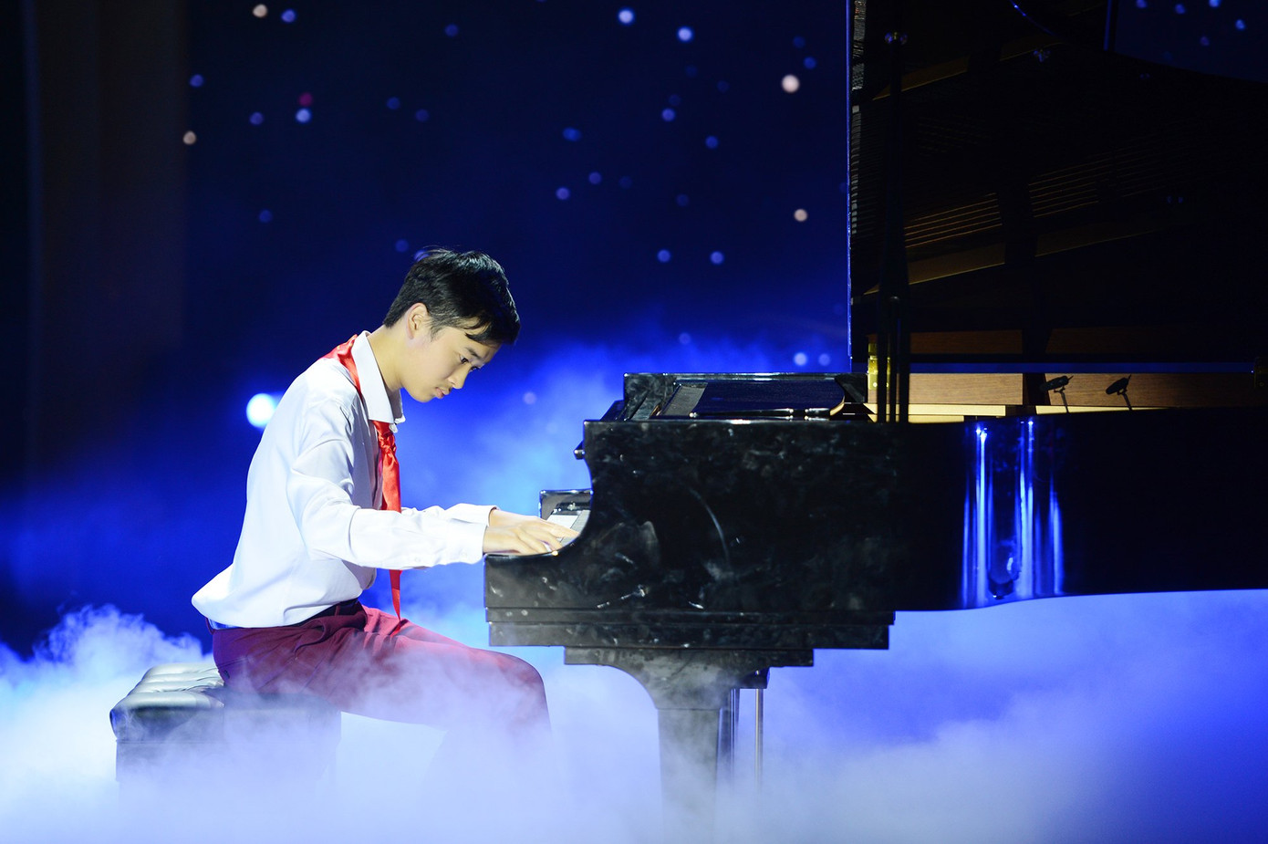 Gương mặt trẻ Việt Nam tiêu biểu 2020 Võ Minh Quang “phiêu” trên phím đàn thể hiện bài dân ca “Trống cơm” trên sân khấu lễ trao giải.
