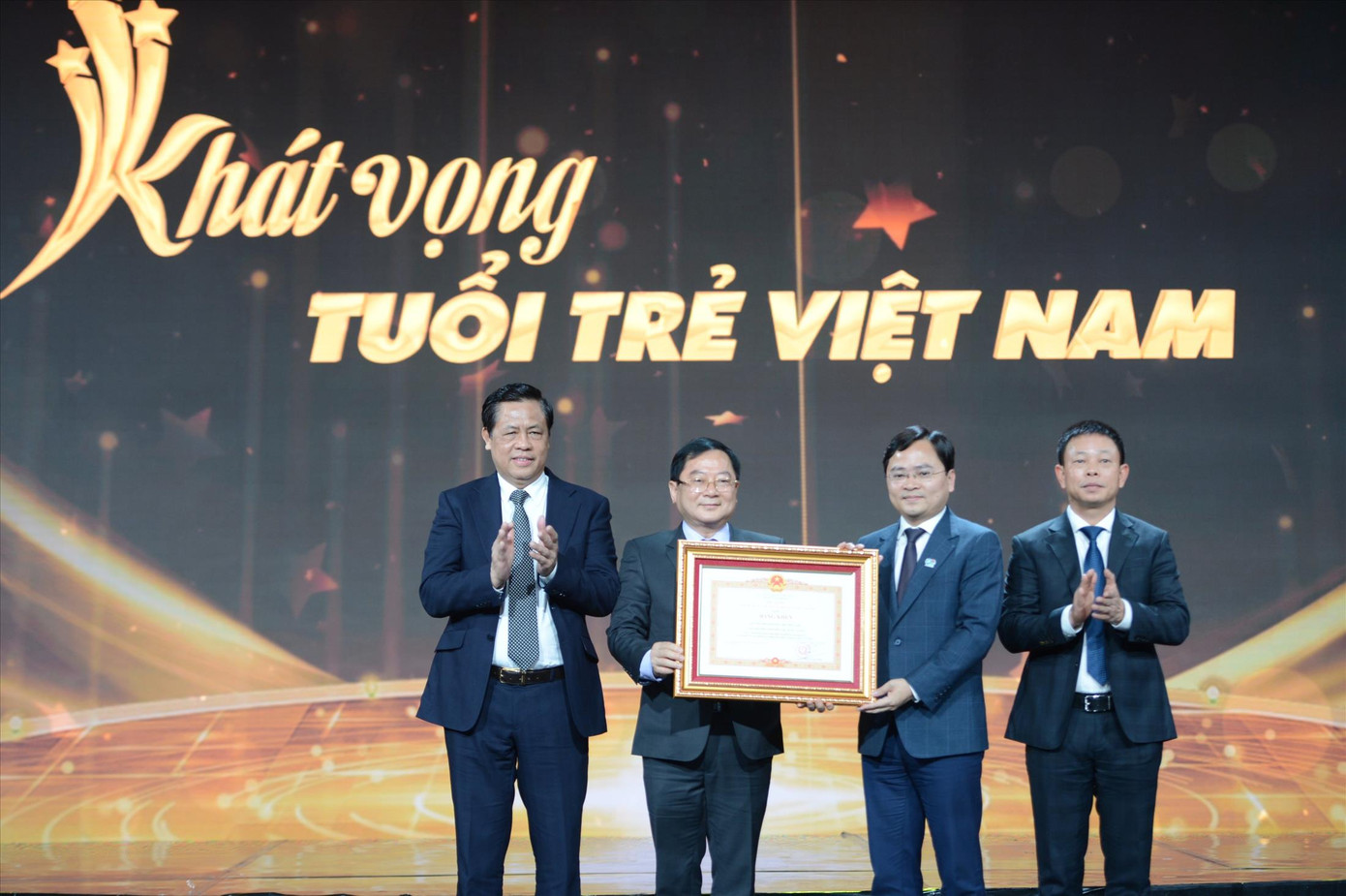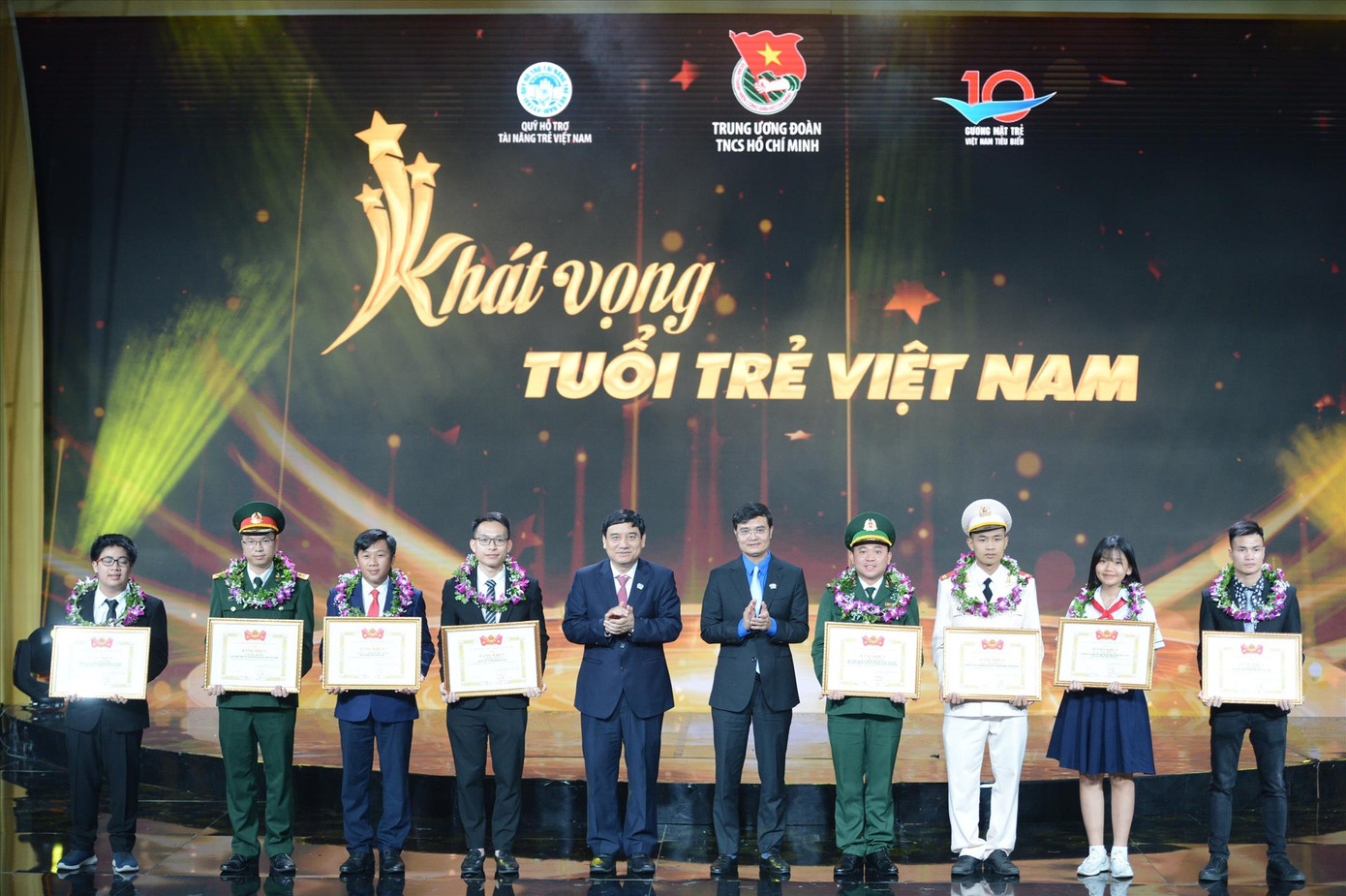 Ông Nguyễn Ðắc Vinh - Ủy viên T.Ư Ðảng, Phó Chánh Văn phòng T.Ư Ðảng và anh Bùi Quang Huy - Ủy viên dự khuyết T.Ư Ðảng, Bí thư Thường trực T.Ư Ðoàn, Chủ tịch T.Ư Hội SVVN trao giải cho 10 gương mặt trẻ Việt Nam triển vọng năm 2020.