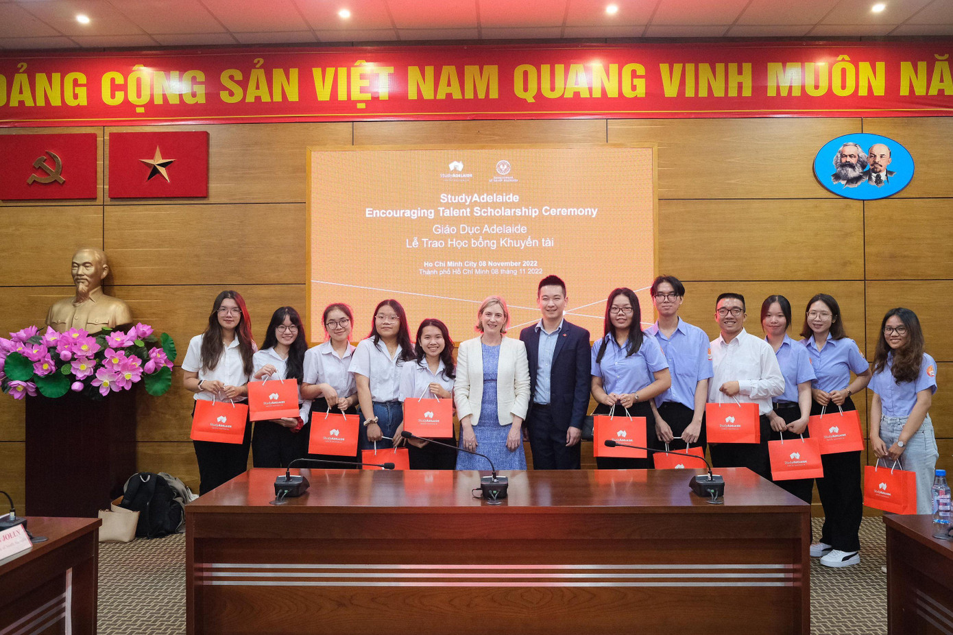 | Bà Jane Johnston, Tổng Giám đốc Giáo dục Nam Úc (StudyAdelaide) trao Học bổng Khuyến học cho các sinh viên nghèo vượt khó tại thành phố Hồ Chí Minh với sự chứng kiến của Bà Frances Adamson AC, Thống đốc Bang Nam Úc. |