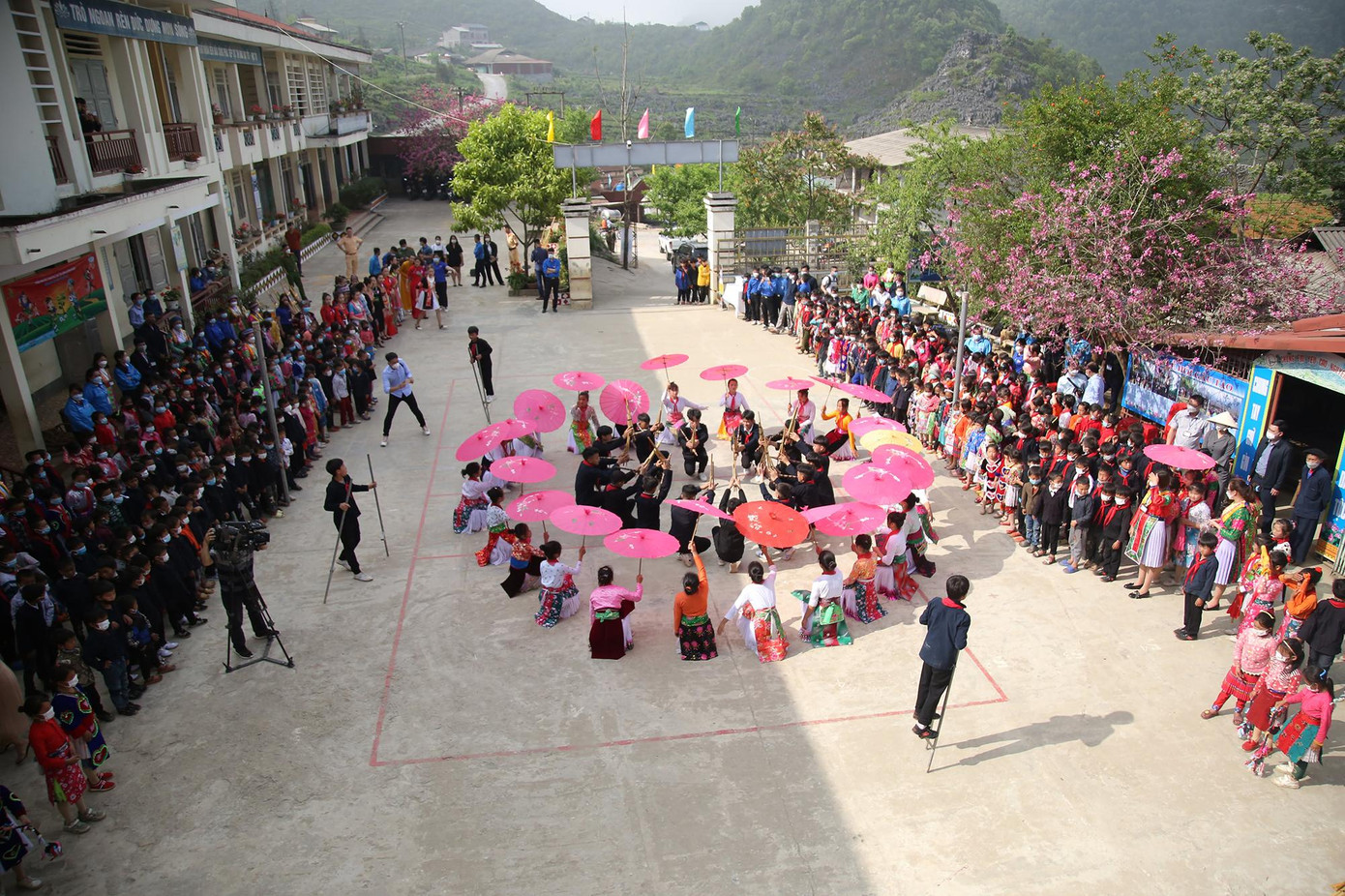 Đoàn đến thăm trường Tiểu học xã Cán Chu Phìn, huyện Mèo Vạc, một trong những trường tiêu biểu với hàng trăm học sinh là con em các dân tộc như: Mông, Pu Péo, Pà Thẻn, Lô Lô, Cờ Lao, Giáy, dao.... Cô giáo Hoàng Lệ Nhung, Hiệu trưởng trường PTDT bán trú Tiểu học, cho biết: Thực hiện Đề án, hằng ngày, trong các giờ giải lao giữa buổi hay hoạt động ngoại khóa, học sinh đều được trường tổ chức chơi các trò chơi dân gian như đẩy gậy, đánh yến, học múa khèn, múa xênh tiền, hát các bài hát dân gian của các dân tộc ở địa phương... Bên cạnh đó, trường còn bố trí tài liệu về VHTT DTTS tại Thư viện Xanh của Nhà trường để phục vụ nhu cầu đọc của học sinh. Đặc biệt là không gian giới thiệu nét văn hóa của các đồng bào dân tộc tới các em học sinh.