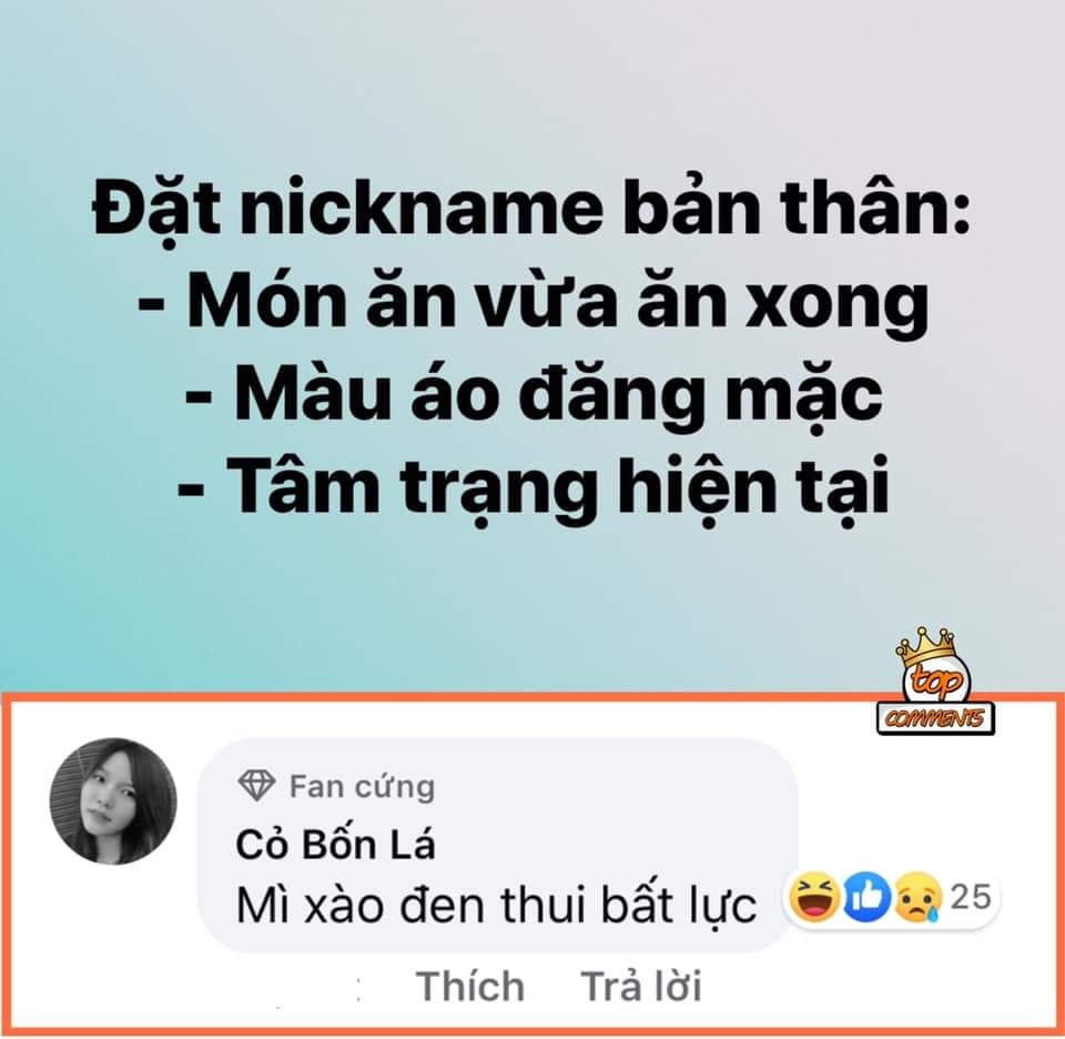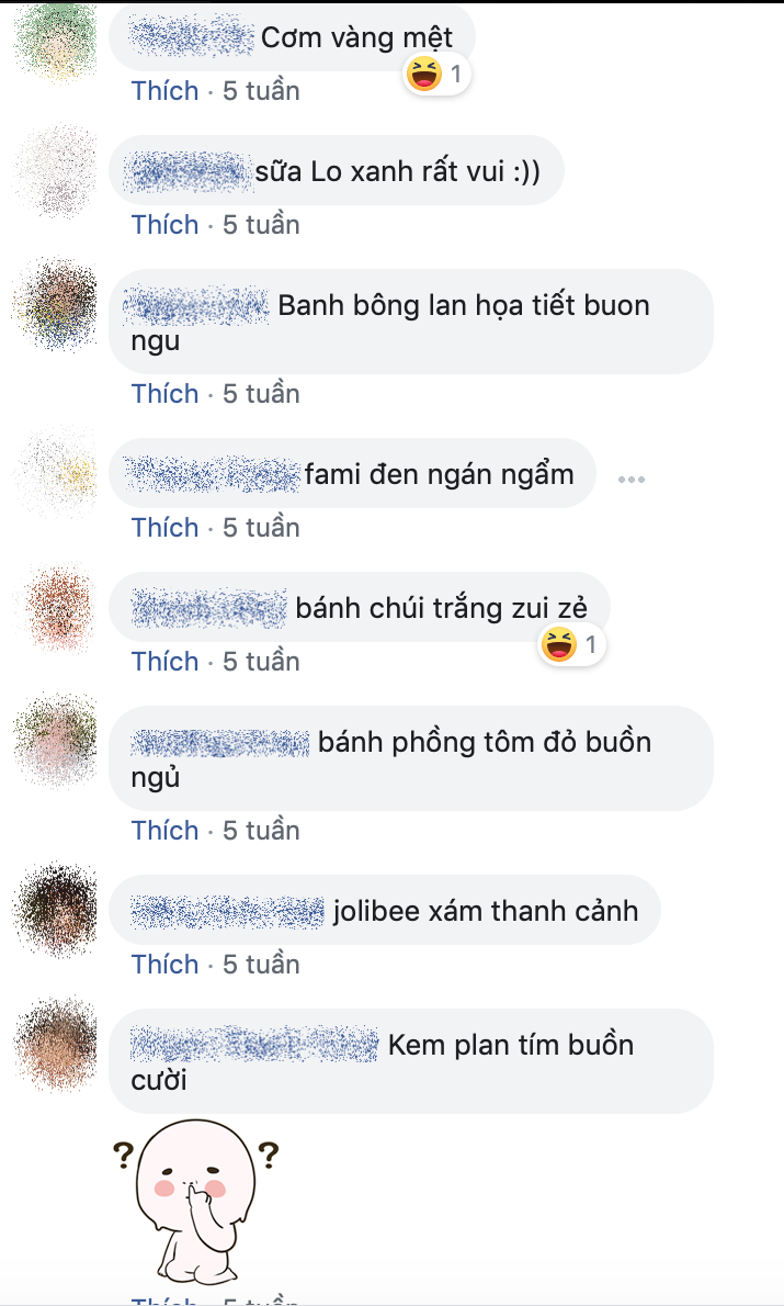 Bài đăng nhanh chóng nhận được sự quan tâm và hàng chục nghìn bình luận của cộng đồng mạng. Kết quả, hàng loạt những nickname mà chính các bạn trẻ tự tạo ra cho mình vừa ngô nghê, vừa hài hước khiến người ta chảy ra nước mắt như "bánh phồng tôm đỏ buồn ngủ", "cơm trắng đau đầu", "sườn nướng trắng lo lắng", "kem plan tím buồn cười"...