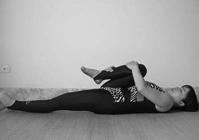 Cách tập yoga nóng. Động tác thoát hơi: Bạn nằm ngửa, hít thở trong khi co chân trái về sát ngực sao cho đùi trên sát bụng, chân phải duỗi thẳng trên sàn. Hai tay ôm chân trái gập. Nâng đầu dậy để gối chậm mũi. Dừng lại, nín thở. Thở ra, trở lại vị trí ban đầu. Lặp lại tương tự với chân phải.
