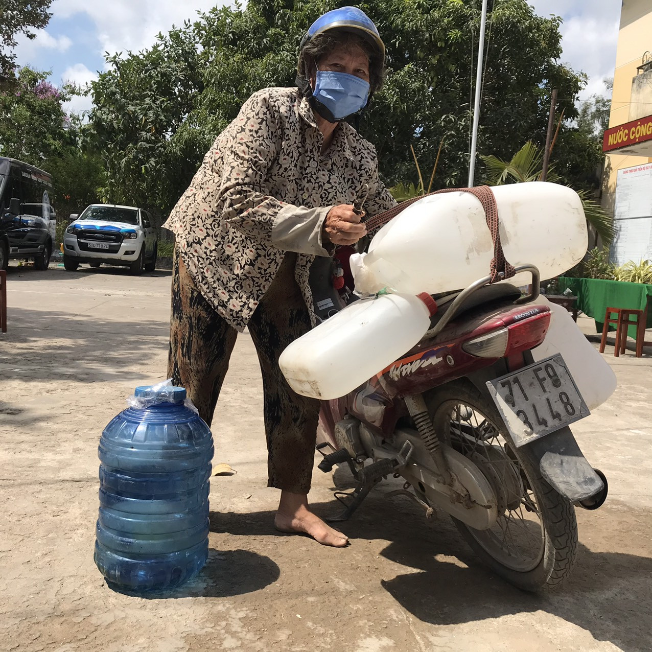Bà Nguyễn Thị Nguyền, 74 tuổi ở ấp 3, xã Phú Vang vui mừng khi nhận can nước ngọt quý như vàng. Bà Nguyền cho biết, năm nay hạn mặn kéo dài, nước sông mặn chát không xài được gì cả, trong khi nghèo không làm ra tiền nên đi xin của người khác nhưng nước bị phèn, nấu ăn cũng khó khăn. Từ đầu mùa khô đến nay bà mua được 1 xe nước 100.000 đồng, chủ yếu để dành tắm, giặt nhưng cũng chỉ vài ngày là hết. Vì thế, bà phải đi xin nước nơi khác về sử dụng cho đỡ tốn kém. "Những giọt nước ngọt bây giờ quý như vàng, không chỉ tôi mà bà con ở xã này vô cùng vui mừng và cảm ơn đơn vị tài trợ", bà Nguyền nói.