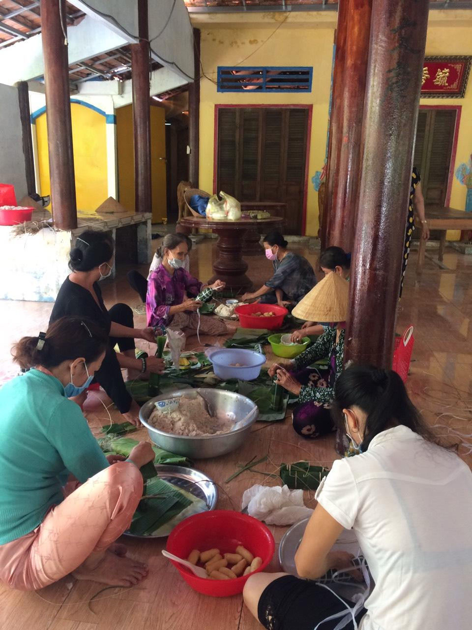 | Người dân Bến Tre chuẩn bị dừa và bánh tét gửi tặng người dân TP. HCM. |