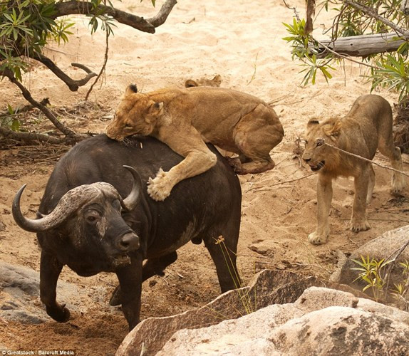 Con trâu già hất văng được con sư tử đang điên cuồng cắn xé khỏi lưng và chạy thoát vào một con sông gần đấy.