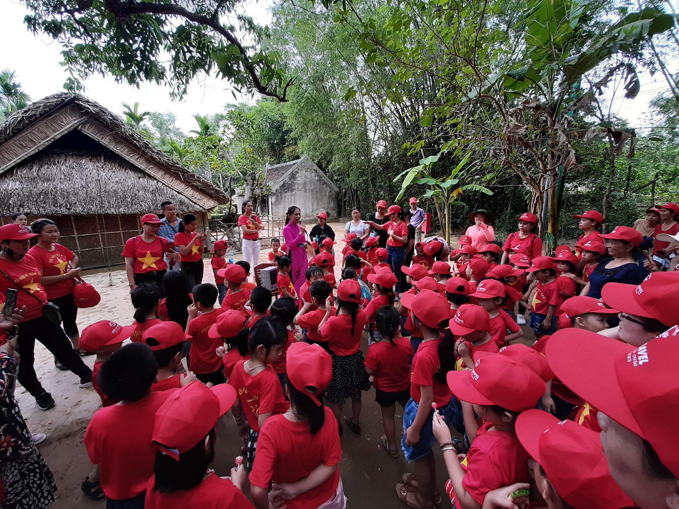 Hàng trăm du khách nhí chăm chú nghe thuyết minh viên kể về thời niên thiếu của Bác Hồ bằng chất giọng xứ Nghệ thân thương.