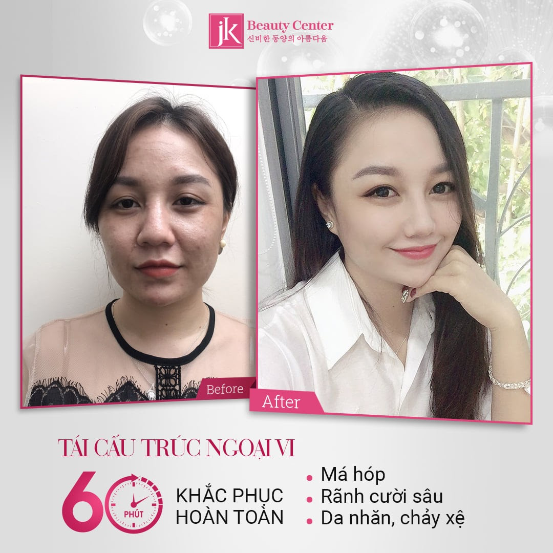 Khuôn mặt rạng rỡ của khách hàng sau liệu trình Tái cấu trúc ngoại tại JK Bên cạnh đó, JK là phòng khám thẩm mỹ hiện đại hàng đầu Việt Nam với không gian thăm khám đạt 5 sao chuẩn Singapore; hệ thống trang thiết bị hiện đại; cùng đội ngũ y bác sĩ giàu kinh nghiệm trực tiếp thăm khám và điều trị cam kết mang lại hiệu quả thay đổi rõ rệt sau 1 buổi điều trị.