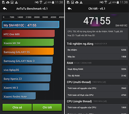 Với cấu hình nhưtrên, thử nghiệm cho thấy máy chạy cực kì mượt mà, thao tác đa nhiệm nhanhchóng với độ phản hồi gần như ngay lập tức. Còn với những ứng dụng nặng haygame 3D, những hiệu ứng hình ảnh rất mượt dù để ở chế độ cao (High) mà khônggây ra hiện tượng giật, lag hay tự thoát ứng dụng. Trong thửnghiệm đầu tiên với AnTuTu Benchmark, Galaxy Note 4 đạt được 47.155 điểm, một sốđiểm rất ấn tượng.