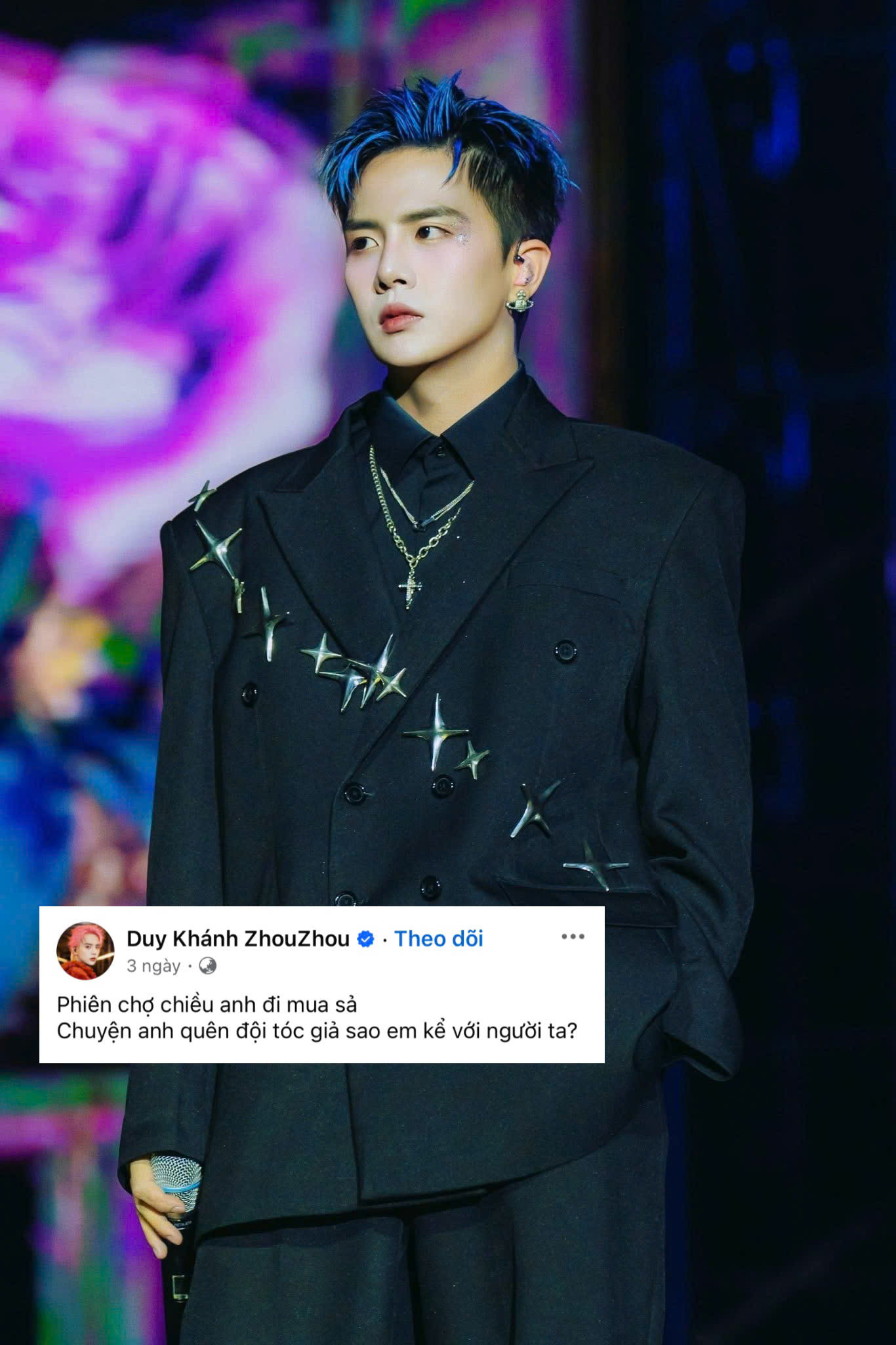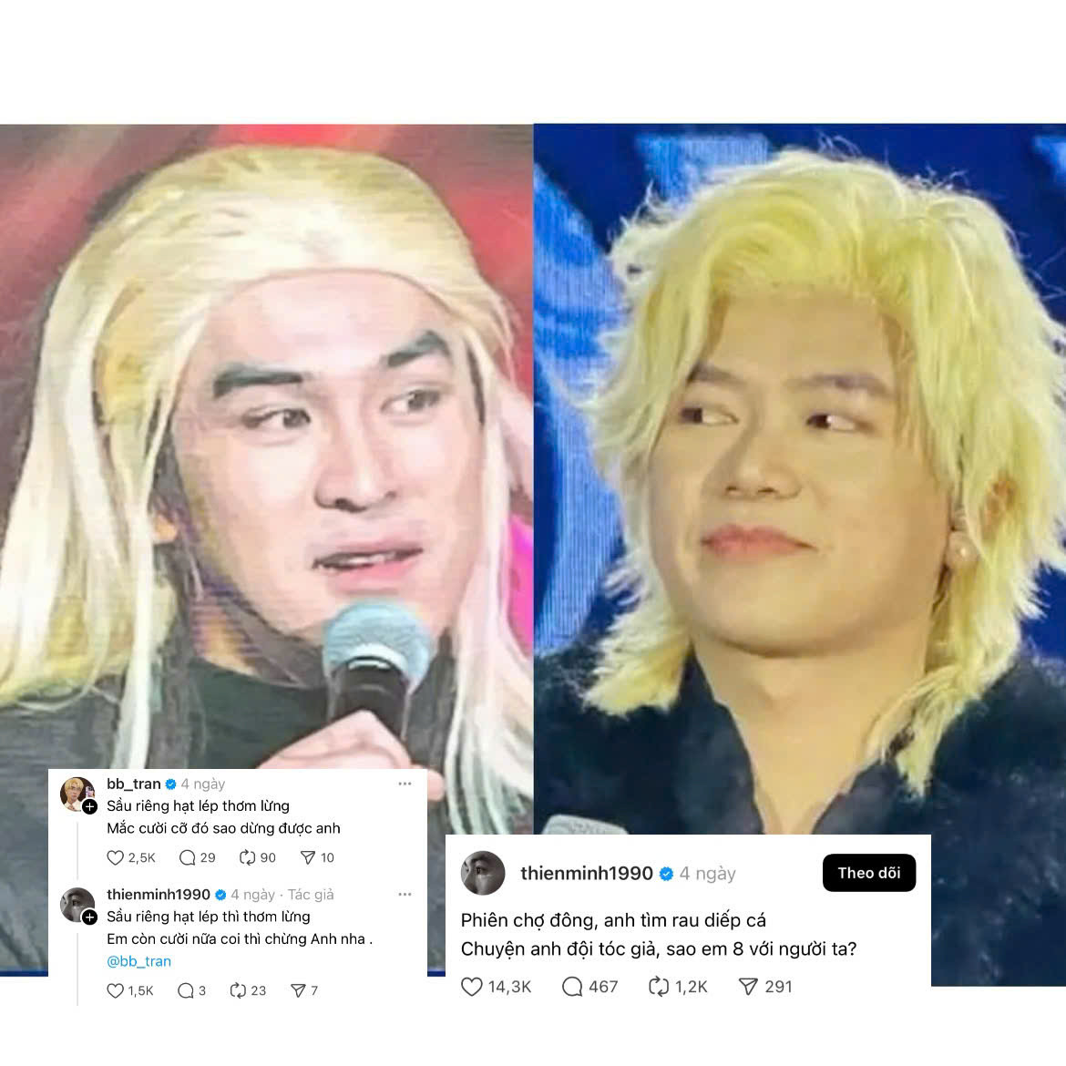 Bên cạnh đó, “kiếp nạn tóc giả” của dàn Anh tài tại concert Chông Gai cũng được các nam nghệ sĩ thể hiện hài hước qua trend này. Duy Khánh, Thiên Minh lần lượt “bóc phốt” mái tóc giả của chính mình, không quên gửi lời “cầu cứu” đến fan. Thiên Minh chia sẻ: "Phiên chợ đông, anh tìm rau diếp cá/Chuyện anh đội tóc giả, sao em tám với người ta".