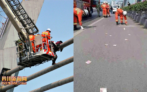 Một người ở Trung Quốc leo lên đỉnh cây cầu cao 30 m rồi ném khoảng 10.000 tệ (gần 1.600 USD) xuống dưới.