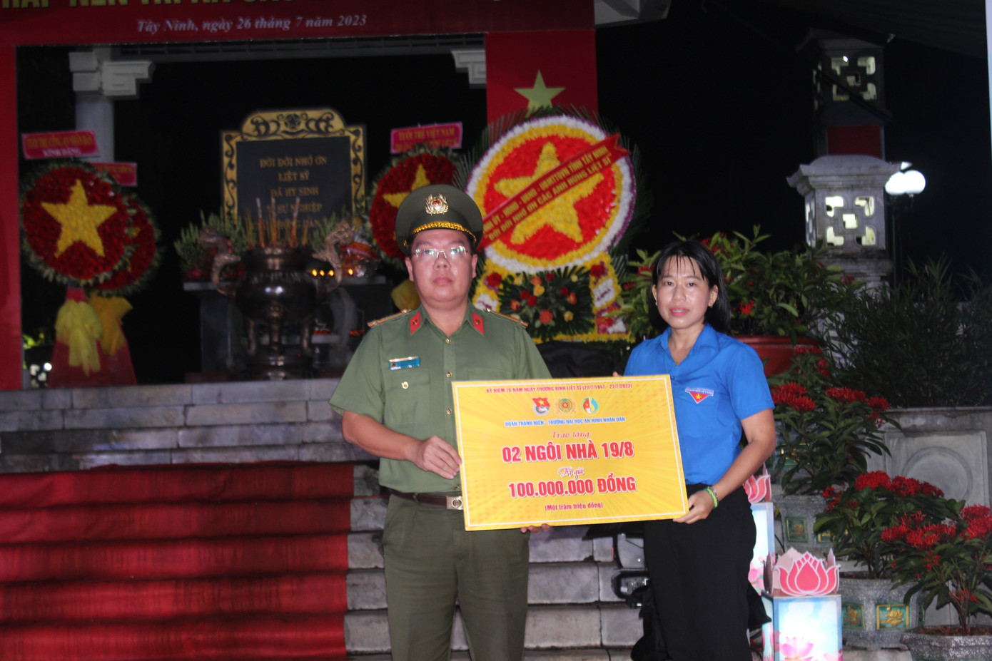Trong chuỗi hoạt động tri ân năm nay, tuổi trẻ Tây Ninh phối hợp với tuổi trẻ Công an cùng các đơn vị đồng hành thực hiện chuỗi hoạt động “Đền ơn đáp nghĩa” gồm: thực hiện công trình thắp sáng đường nội bộ nghĩa trang liệt sĩ huyện Tân Biên bằng đèn năng lượng mặt trời; trao tặng 2000 cây xanh vào vườn cây thanh niên; 3 ngôi Nhà đồng đội, Nhà tình nghĩa; thăm hỏi tặng quà 25 Mẹ Việt Nam anh hùng; khám bệnh, cấp phát thuốc tặng quà cho 300 gia đình chính sách, nhân dân nghèo, trao tặng 1,5 tấn gạo và 6000 quả trứng gà; trao tặng 300 suất học bổng trực tuyến cho thanh thiếu nhi; thăm hỏi tặng quà cho 15 Cựu Thanh niên xung phong; trao tặng 2 ngôi nhà nhân ái, 2 ngôi Nhà đồng đội 19/8 với tổng giá trị các phần việc hơn 800 triệu đồng.