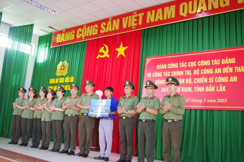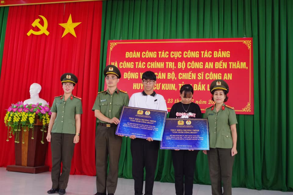 Tặng 2 bộ máy tính cho Công an 2 xã Ea Ktur, Ea Tiêu nhằm hỗ trợ công tác nghiệp vụ; trao tặng 400 bộ quần áo mới cho các em học sinh người dân tộc thiểu số trên địa bàn huyện Cư Kuin; nhận nuôi thường xuyên 2 cháu là con liệt sĩ Công an trong vụ việc xảy tại xã Ea Ktur, Ea Tiêu, trong chương trình “Con nuôi Công Đoàn” từ nay đến 18 tuổi với mức hỗ trợ 5.000.000đ/năm/1 cháu.