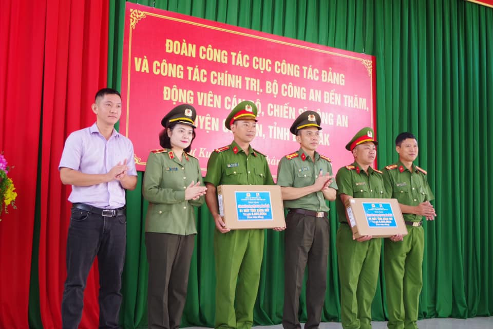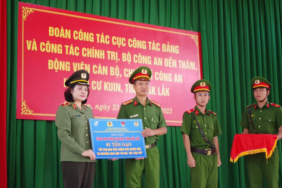 Tiếp đó, đoàn đã tổ chức thăm, động viên cán bộ chiến sĩ Công an huyện Cư Kuin, tỉnh Đắk Lắk. Tại đây, Đoàn công tác đã trao tặng 1 tấn gạo ủng hộ chương trình “Hỗ trợ nhu yếu phẩm cho người dân tự nguyện giao nộp vũ khí, vật liệu nổ” của Công an huyện Cư Kuin.