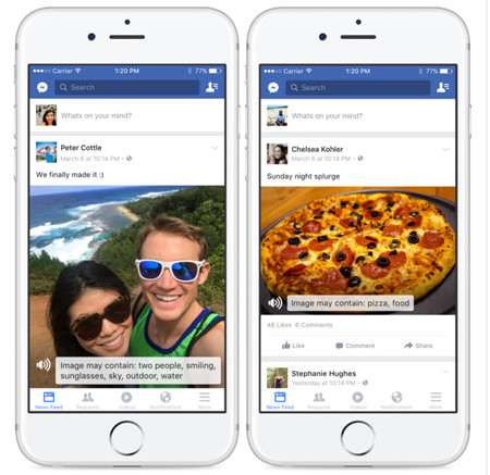 Mỗi ngày, người dùng đăng trung bình 2 tỷ bức ảnh lên Facebook, Instagram, Messenger và WhatsApp. Sử dụng công nghệ nhận diện vật thể, khi bắt gặp một bức ảnh, hệ thống AI sẽ chuyển đổi thông tin về tấm hình dưới dạng văn bản, lời nói. Người có thị lực kém sẽ nghe nội dung mô tả, chẳng hạn: "Trong ảnh có hai người đeo kính, mỉm cười, bầu trời, bên ngoài, nước".