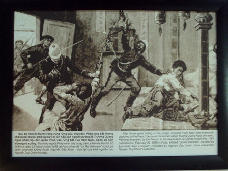 Sau ba năm ẩn tránh trong rừng sâu, thực dân Pháp lùng bắt nhưng không được, Vua Hàm Nghi không may bị tên người hầu là Trương Quang Ngọc phản bội dẫn quân Pháp vào rừng bắt vua. Trong ảnh là minh họa về cuộc bắt giữ do người Pháp thực hiện.