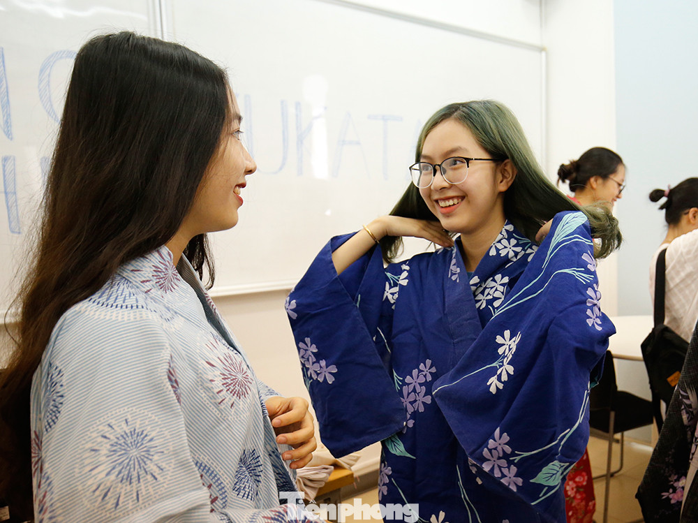 Đặc biệt trong buổi Khai mạc, BTC có thêm hoạt động mặc thử Yukata (trang phục truyền thống mùa hè Nhật Bản) Trong ảnh: 2 bạn Linh và Ngân đến từ trường ĐH Luật năm thứ nhất, tham gia mặc thử trang phục Yukata Nhật Bản.