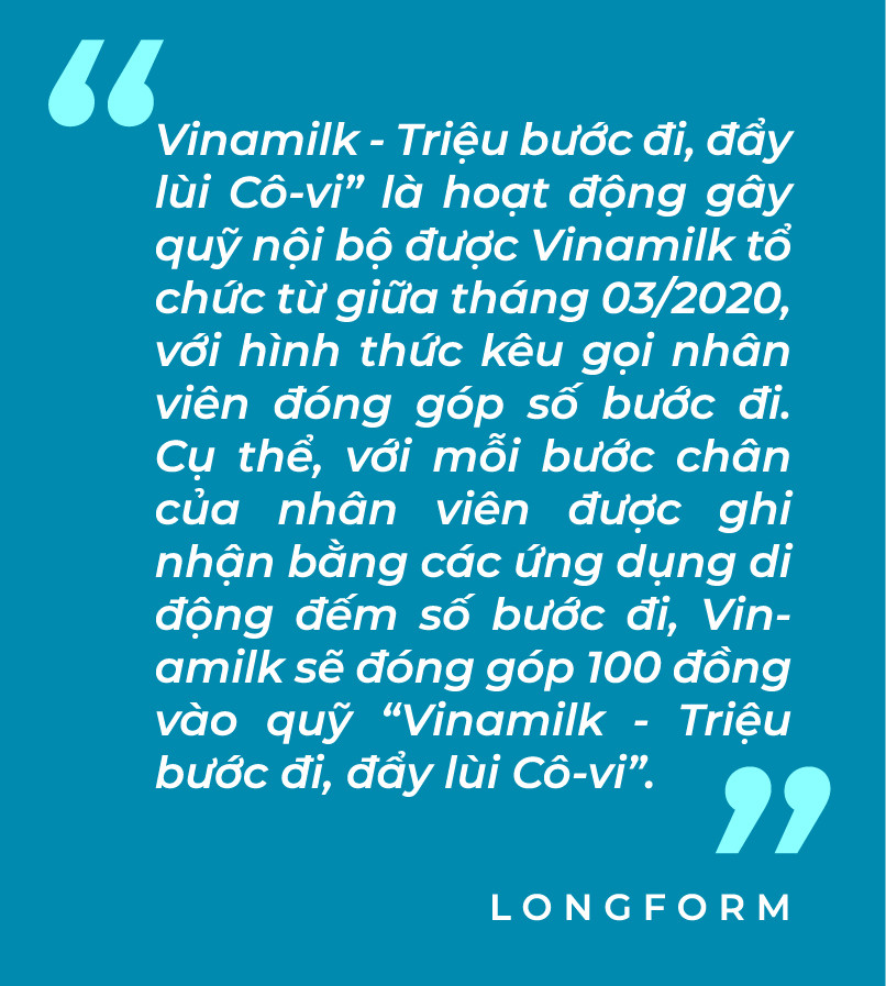 Bên cạnh hoạt động “Vinamilk - Triệu bước đi, đẩy lùi Cô-vi”, tập thể nhân viên Vinamilk đã tự nguyện đóng góp một ngày lương để thực hiện các chương trình hỗ trợ cộng đồng chống lại đại dịch. Gần đây nhất, tập thể nhân viên Vinamilk đã gửi tặng 2.000 bộ đồ bảo hộ y tế và khẩu trang chuyển dụng đến các y bác sỹ tuyến đầu chống dịch của TP.HCM.