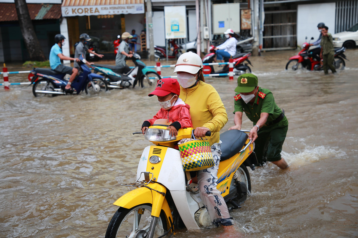 | Hỗ trợ người dân qua những chỗ ngập sâu. |