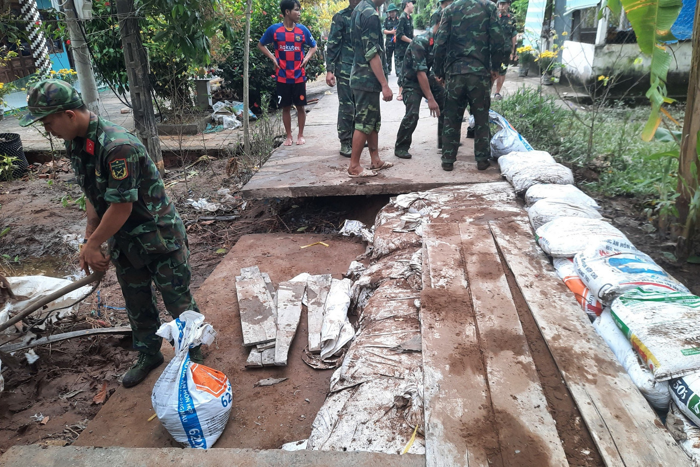 Tại thành phố Trà Vinh bị sạt lở, sụp lún 4 đoạn đường bê tông với chiều dài 50 m ở xã Long Đức làm nước tràn vào nhà dân. Hàng chục cán bộ, chiến sĩ thuộc lực lượng quân đội được huy động cùng cán bộ, dân quân địa phương gia cố tạm thời cho phương tiện và người dân qua lại…